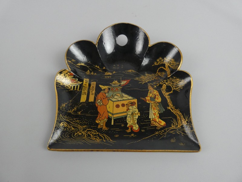 Breng oosterse elegantie in huis met deze unieke, antieke Japanse kruimelbak. Dit decoratieve object is vervaardigd uit klassiek zwart lakwerk en rijkelijk versierd met de hand geschilderde taferelen in goud- en kleuraccenten.
