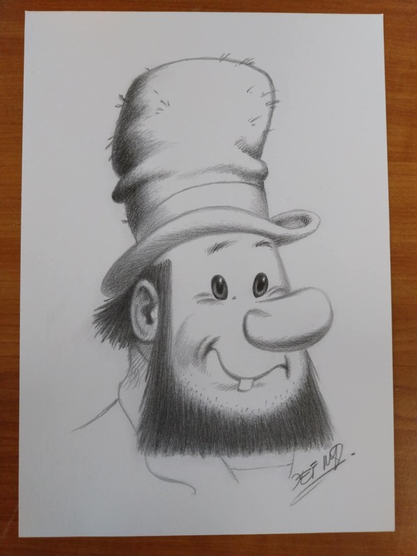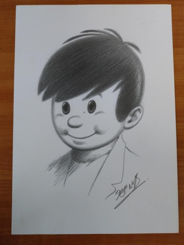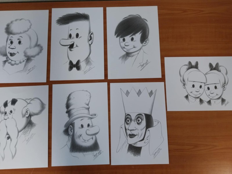 7 Prenten van tekenaar Jef Nys uit de gekende stripreeks rondom het personage: "Jommeke". Het gaat om prenten van de figuren: "Marie de moeder", "Theopiel de vader", "Filiberke", “Annemieke en Rozemieke”, "Professor Gobelijnen "Boemel de landloper", “de koningin van Onderland”. De tekeningen zijn prints op een dik tekenpapiersoort van de originele potloodtekeningen van wijlen: "Jef Nys", iedere prent bevat ook de handtekening van de godfather van Jommeke.