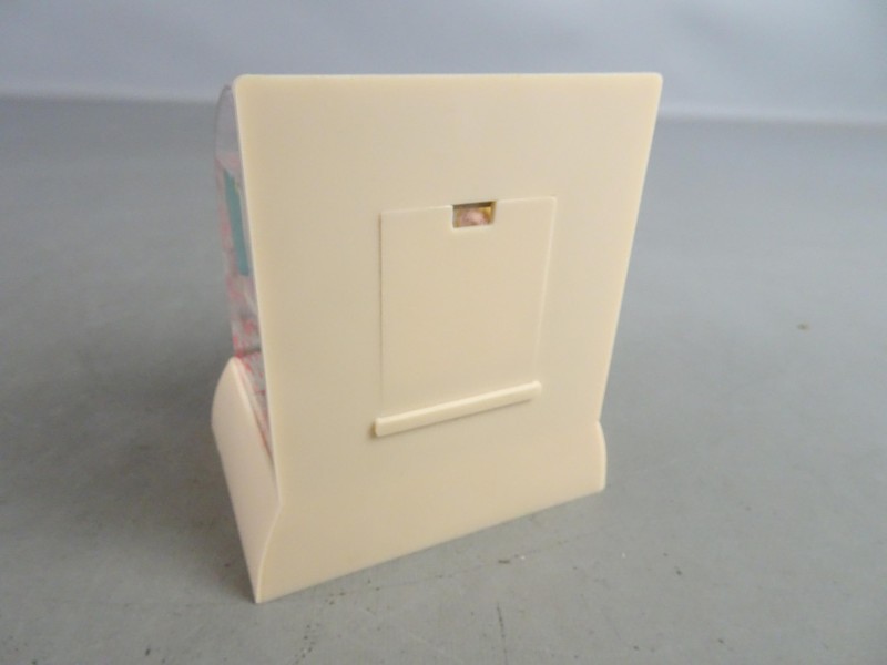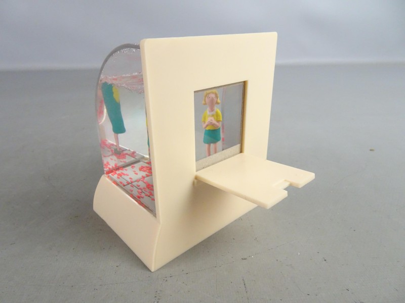 Charmant sneeuwbol object, dat een miniatuurscène met een figuurtje bevat. De binnenzijde toont een roodstenen muur met een poster waarop 'WANTED' en 'REWARD' te lezen is, en een figuurtje van een vrouw met blond haar en een geel-met-turquoise outfit. De bol is gevuld met een vloeistof en kleine, rode, hartvormige deeltjes die lijken op confetti. De achterkant is voorzien van een uitklapbare standaard, waardoor het object als fotolijstje of display kan worden gebruikt. De onderkant van de bol vermeldt "©1986 JOHN JONCK LICENSEE ENESCO CORPORATION MADE IN CHINA", wat een indicatie geeft van de productiedatum en -herkomst. Dit is een uniek en decoratief item, perfect voor verzamelaars of liefhebbers van vintage curiosa.