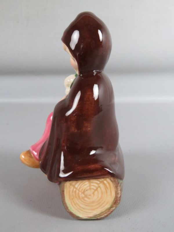 Onderwerp: Het beeldje toont een jong meisje, gehuld in een glanzende donkerbruine kapmantel (wat doet denken aan Roodkapje), zittend op een boomstronk. Ze houdt een klein, wit lammetje stevig vast.