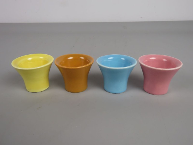 Dit is een set van vier vintage keramische eierdopjes in heldere, pastelachtige kleuren.