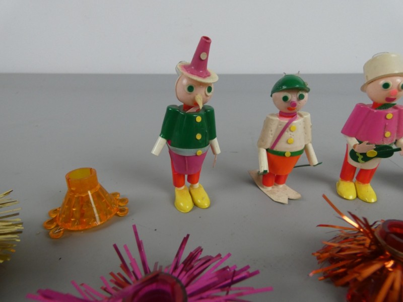 Vier kleine figuurtjes: Deze lijken op traditionele Europese (vaak Duitse of Ertsgebergte) kerstornamenten, waaronder een figuurtje met een lange neus (Pinokkio-stijl) en personages in kleurrijke klederdracht.