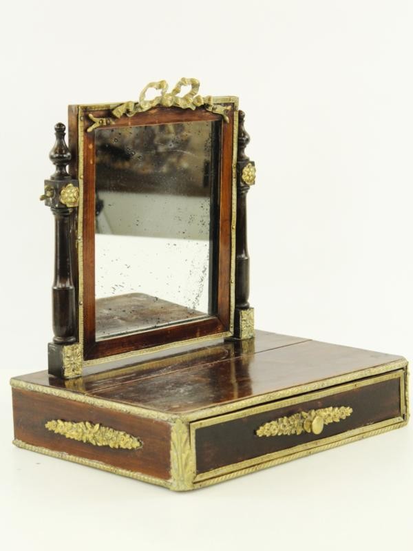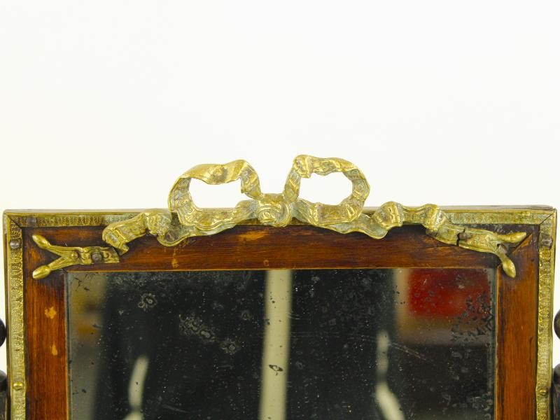 Elegant houten sieradenkistje met een opklapbare spiegel. De spiegel wordt omlijst door florale motieven in goud kleurige messing, waaronder decoratieve zuiltjes aan weerszijden en een strikornament bovenaan.