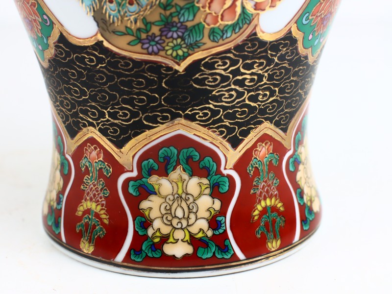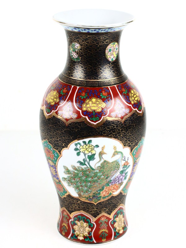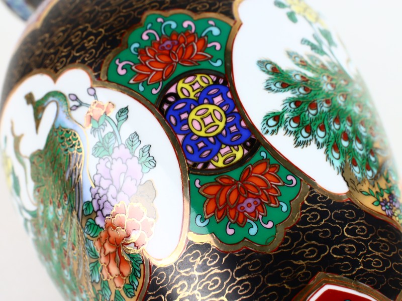 Prachtige kleine Chinees handbeschilderde porseleinen vaas, voorzien van kleurrijke bloemmotieven en twee sierlijke pauwen. De typische look wordt gecreëerd door met de hand geschilderde goudkleurige lijnen, niet door metalen draad (cloisonné), waardoor de vaas lichter en fijner afgewerkt is.