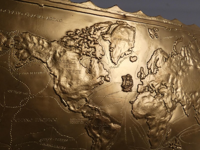 Details: Voorzien van sierlijke teksten (Spaans), scheepsillustraties, een kompasroos en reliëfopdruk van de continenten.