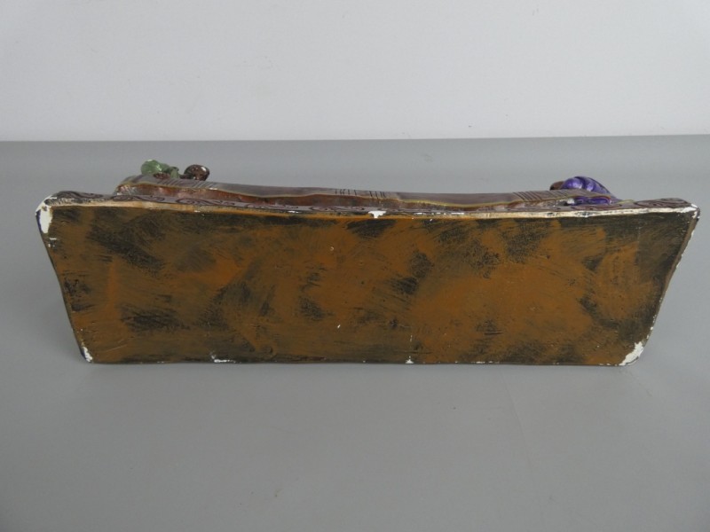 Het is een religieus decoratief object, waarschijnlijk gemaakt van hars of een vergelijkbaar materiaal.