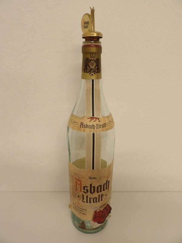 Ook de smeedijzeren flessendrager is gemaakt door Asbach Uralt (zie gravering aan voorkant).