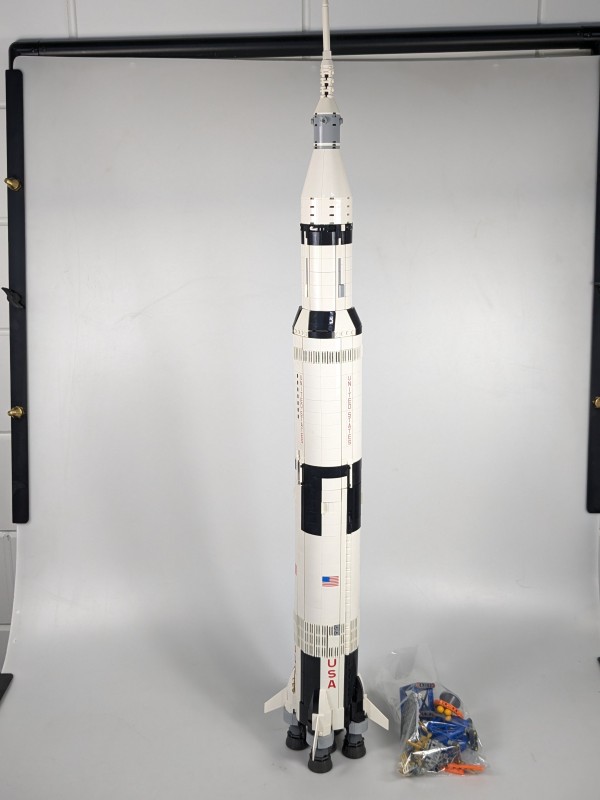 Gedetailleerde replica van de Saturn V raket, inclusief afneembare trappen en maanlandingsmodule