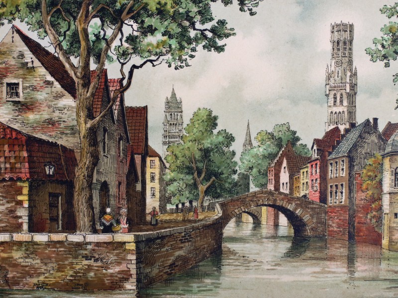 Prachtige kleurrijke afdruk/reproductie van een werk van Barday, van de Groene Kaai met de Groene Rei te Brugge. Een betoverend uitzicht op het historische stadscentrum. Vanaf deze kade kijk je uit over het water met op de voorgrond de elegante boog van de Peerdenbrug die de oevers verbindt. Achter de brug rijzen de iconische torens van Brugge op: de imposante Belforttoren, de sierlijke toren van de Heilig-Bloedkapel en de gotische contouren van de Sint-Salvatorskathedraal.
