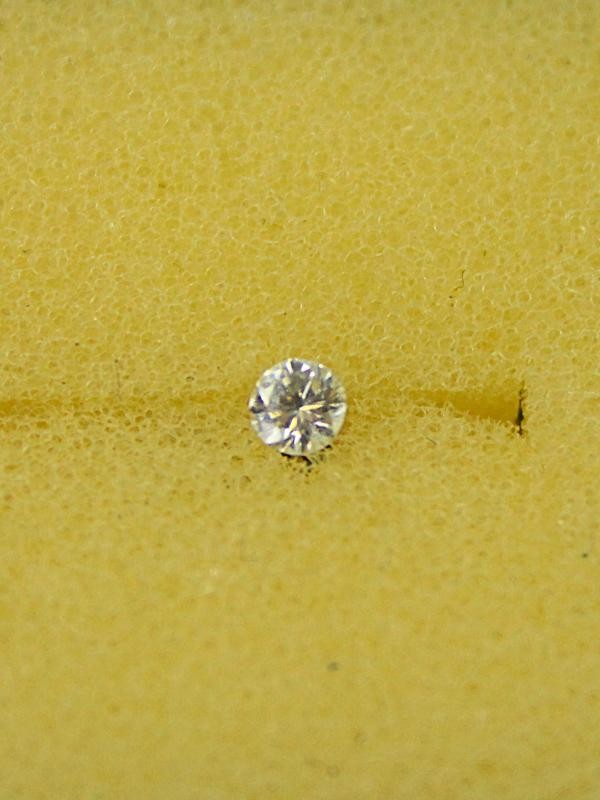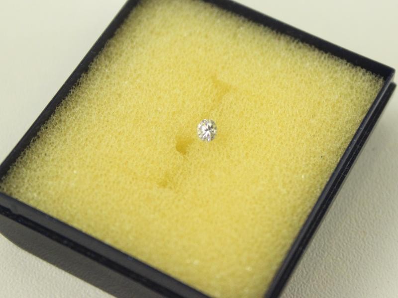 De steen meet circa 3 mm in diameter en 2 mm in hoogte, wat overeenkomt met een geschat gewicht van ongeveer 0,1 karaat.