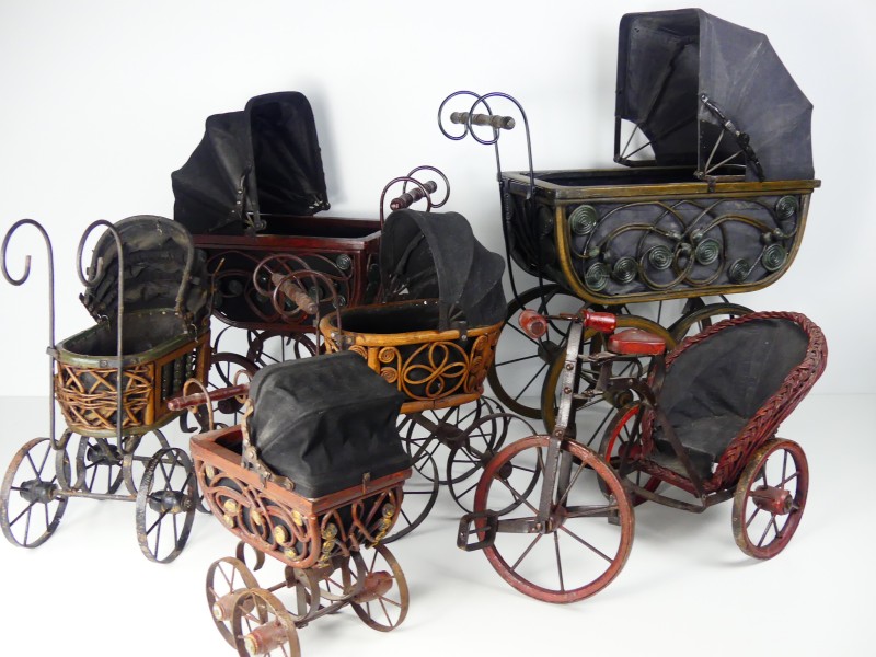 Een lot van 5 kleine kinderwagens en 1 driewieler, allemaal als decoratie items.