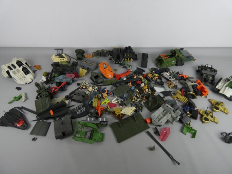 Lot van vintage G.I. Joe speelgoed, voornamelijk bestaande uit grote onderdelen van voertuigen en playsets (groen, grijs en zwart) en een hoop kleine actiefiguren (3.75 inch) en accessoires.