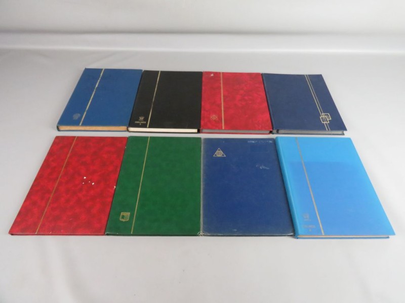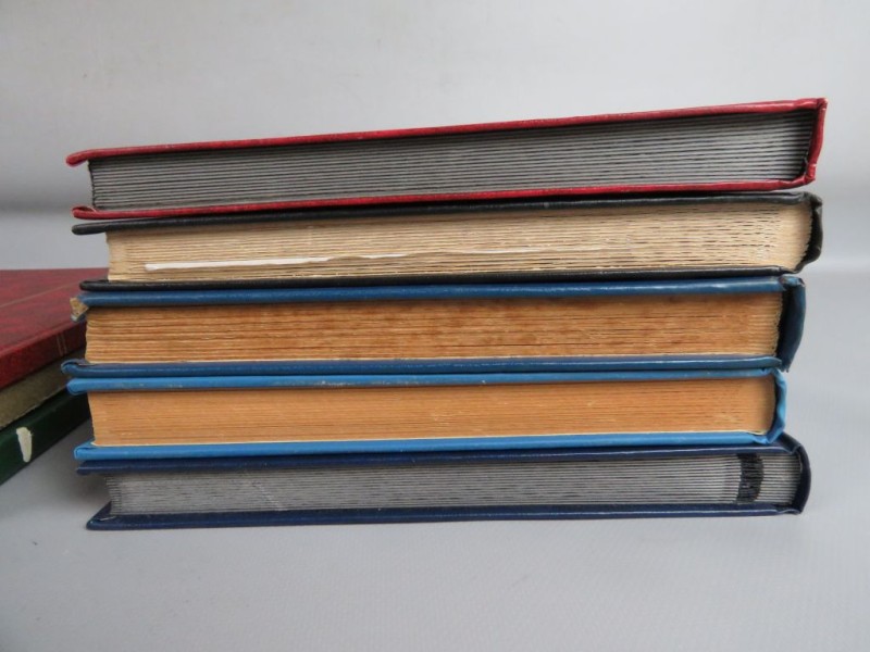 Lot van acht albums 31 x 22.5 cm met verschillende kleuren kaften. De kleuren, van boven naar beneden, zijn: blauw, donkergroen, felrood, lichtblauw, beige/blauw, donkerblauw en zwart. De stapel bevat items van verschillende diktes en de randen van de pagina's variëren in kleur.