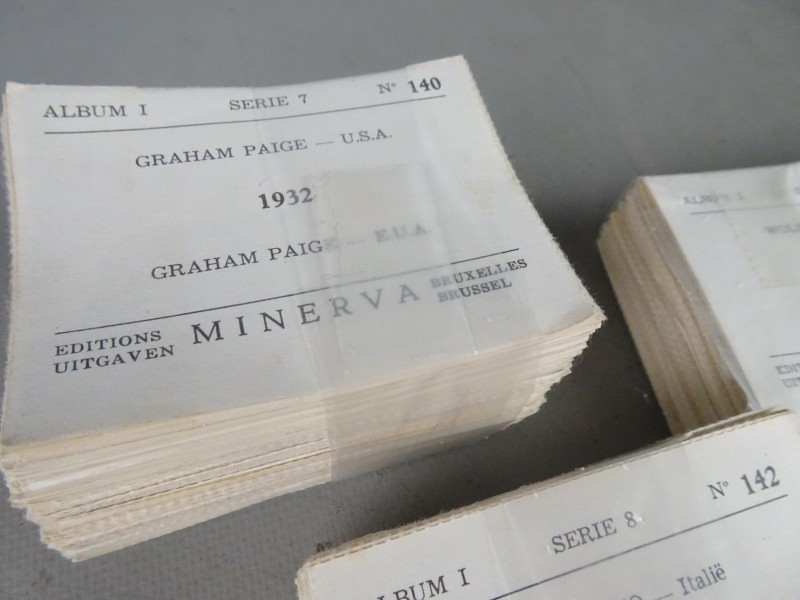 Partij originele Minerva verzamelplaatjes, uitgegeven in Brussel in de jaren 1950. De plaatjes horen in de bekende Minerva autoverzamelalbums en tonen klassieke automerken en -modellen uit verschillende landen en bouwjaren.