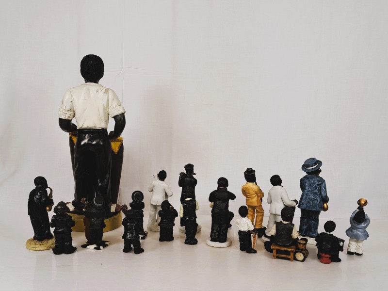 Decoratief lot met jazzmuzikanten en figuranten. Het lot bevat 17 beeldjes in totaal. Centraal staat een grote percussionist met conga’s. Rondom staan muzikanten met instrumenten. Je ziet onder meer saxofoon, trompet en contrabas. Ook een pianist en meerdere drummers zijn aanwezig.