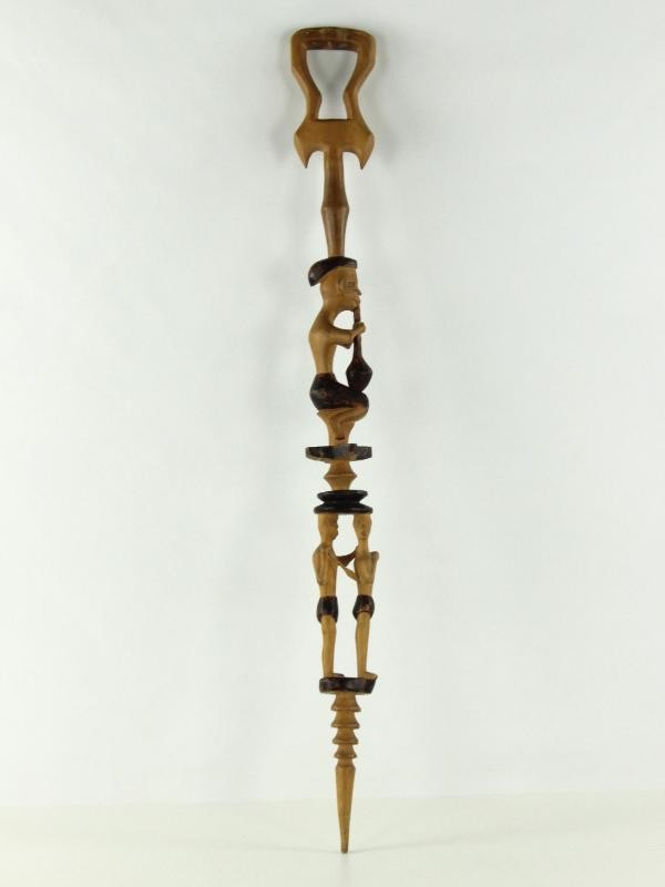 Wandelstok 1: Sculpturale stok met meerdere uitgesneden menselijke figuren, boven of naast elkaar geplaatst.