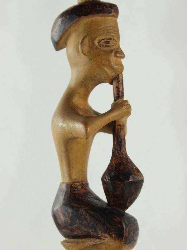 Verhalend en decoratief, met duidelijke invloeden uit volkskunst en Afrikaanse beeldtaal. Houten punt onderaan.