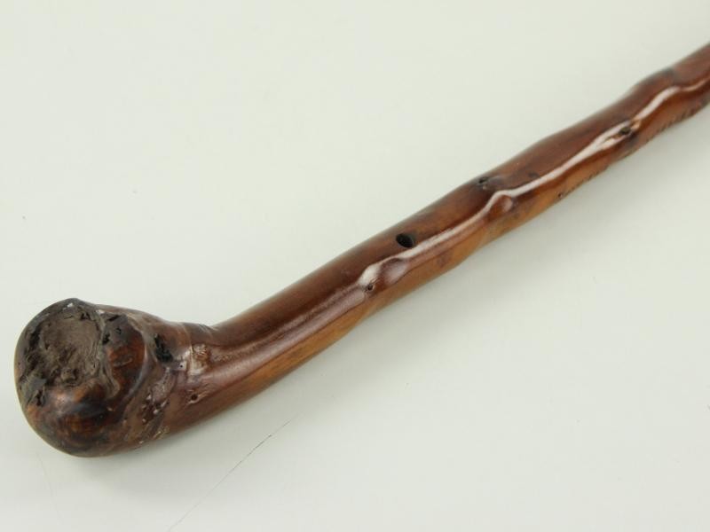 Wandelstok 3: Eenvoudigere, maar wel heel knappe houten stok met een rustieke, natuurlijke vorm, waarbij de knopen en nerf van het hout zichtbaar blijven.
