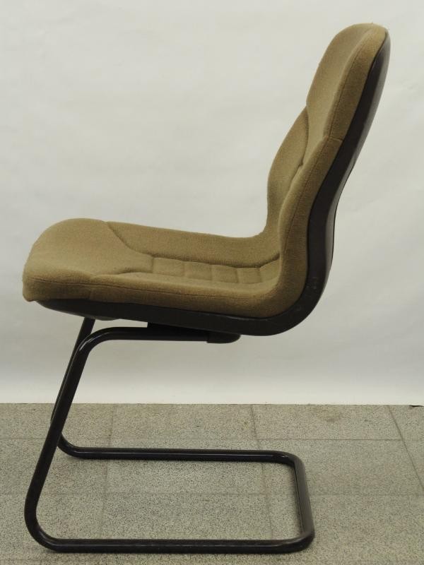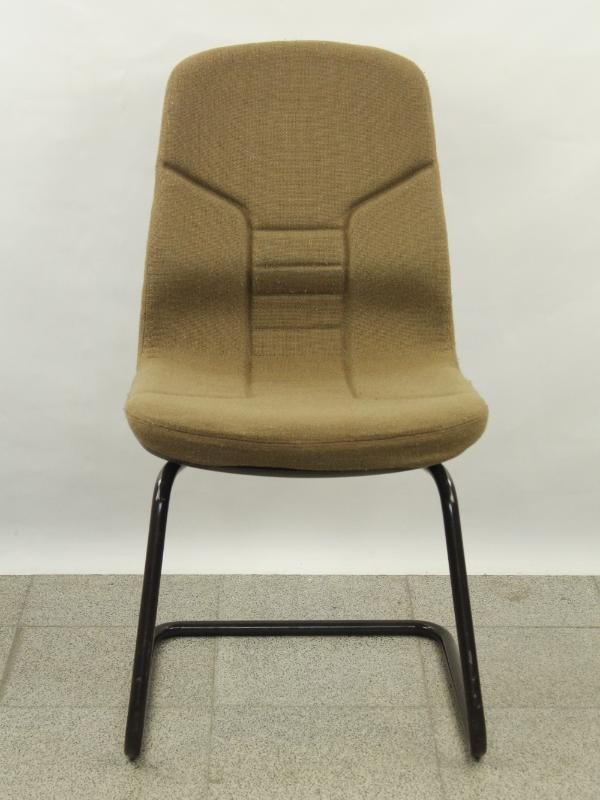 De stoelen hebben een elegante sledepoot in zwart metaal en een comfortabel gevormde zitting en rugleuning in een warme beige/olijfkleurige tint.