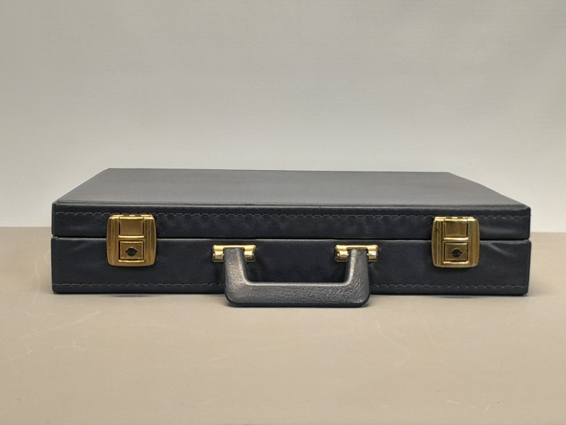 - Wordt geleverd in de originele zwarte opbergkoffer met een stijlvolle blauwe binnenzijde. De kunststof binnenkant en bestekinzet tonen enkele sporen van gebruik passend bij de leeftijd.