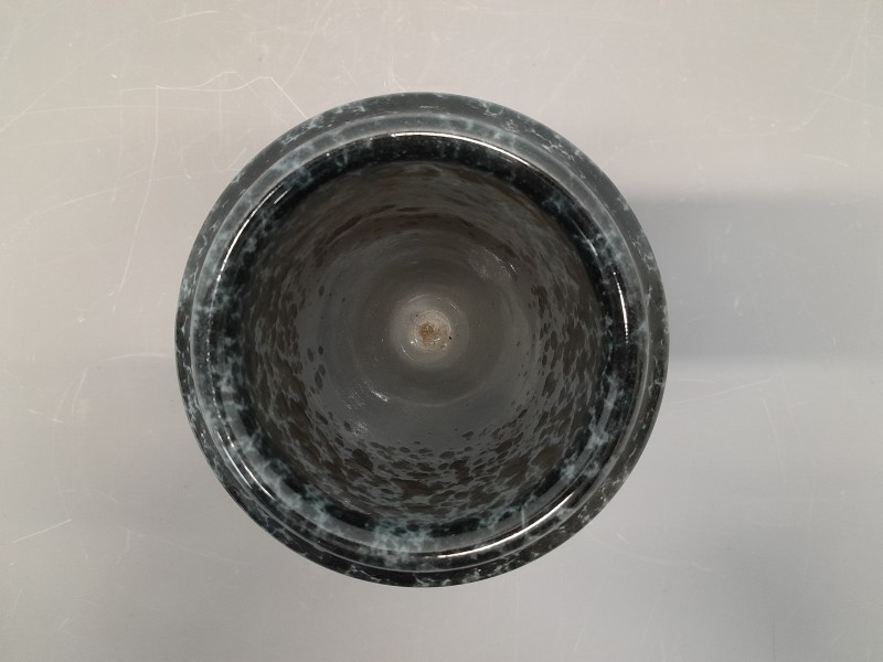 Dit is een vaas van het merk La Croix d'Ossau, gemaakt van zwart geëmailleerd graniet. De vaas heeft een gespikkeld patroon in donkere en lichte tinten. Vanwege de vorm en het materiaal wordt dit type vaas vaak gebruikt als grafvaas of bloembak voor een grafmonument.
