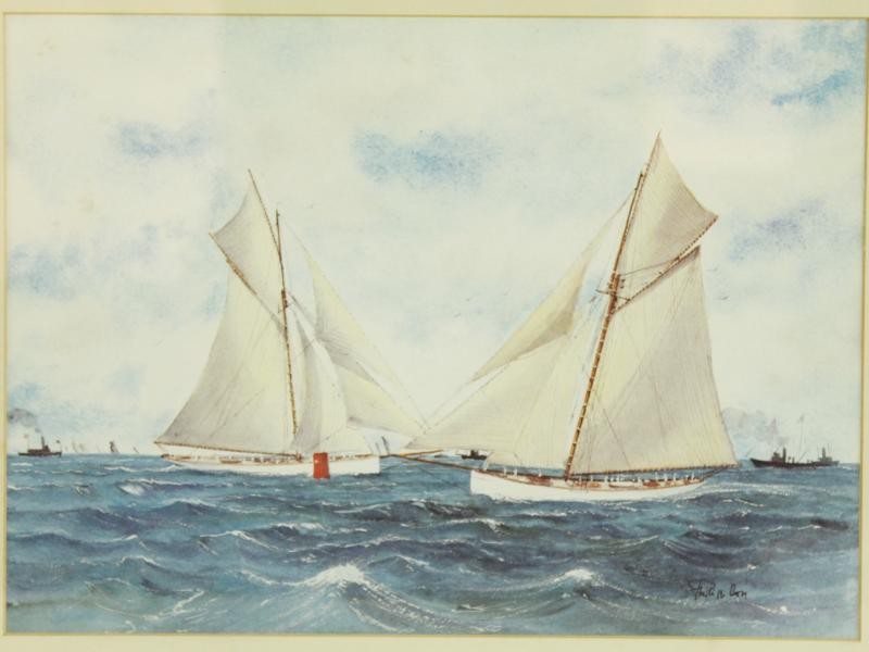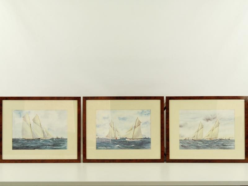 Dit maritiem drieluik bestaat uit drie ingelijste aquarellen met voorstellingen van zeilschepen op zee. Elk werk toont een dynamisch zeegezicht met klassieke zeilboten in beweging, gecombineerd met subtiele weergaven van horizon, lucht en begeleidende scheepvaart. De composities zijn onderling verwant en vormen samen een harmonieus geheel.