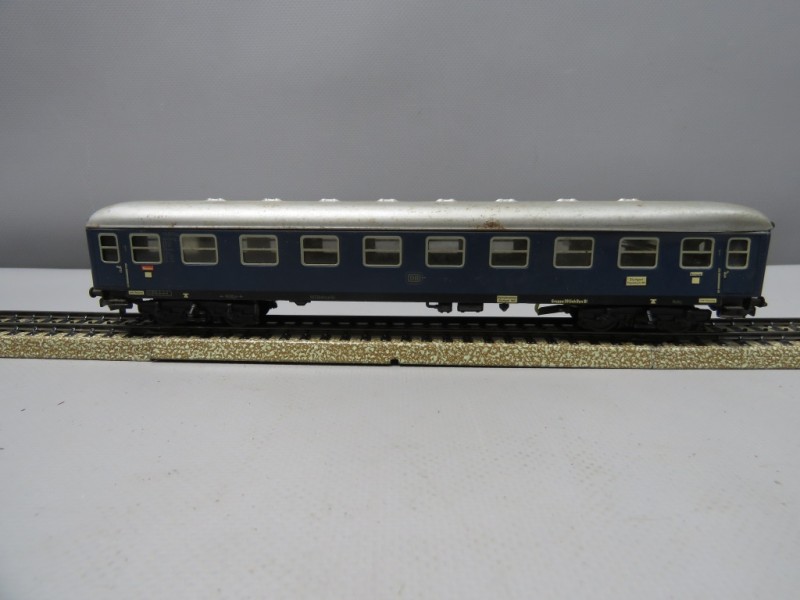donkerblauw personenrijtuig met een zilveren dak. Het lijkt een tweedeklasrijtuig te zijn, blijkens het "2"-symbool aan één uiteinde (hoewel niet duidelijk zichtbaar op deze specifieke foto, is het typisch voor dergelijke rijtuigen). Markeringen voor de Deutsche Bundesbahn (DB) zijn zichtbaar. Het dak vertoont enige tekenen van slijtage of patina.