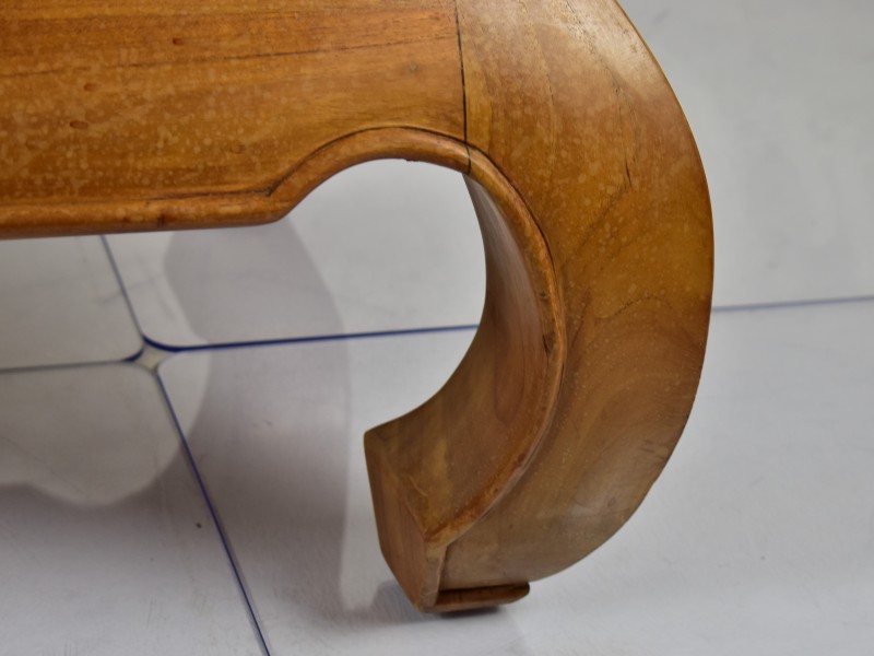 Deze lage houten salontafel is gemaakt van massief hout, vermoedelijk teak of een vergelijkbare tropische houtsoort. Het ontwerp is opvallend door de sierlijke, gebogen poten en de natuurlijke houtnerf die mooi zichtbaar is in het blad.