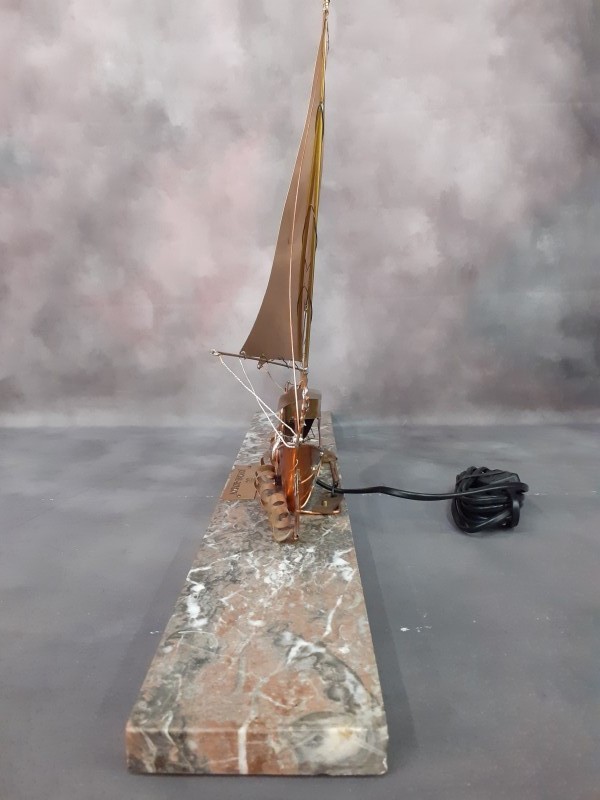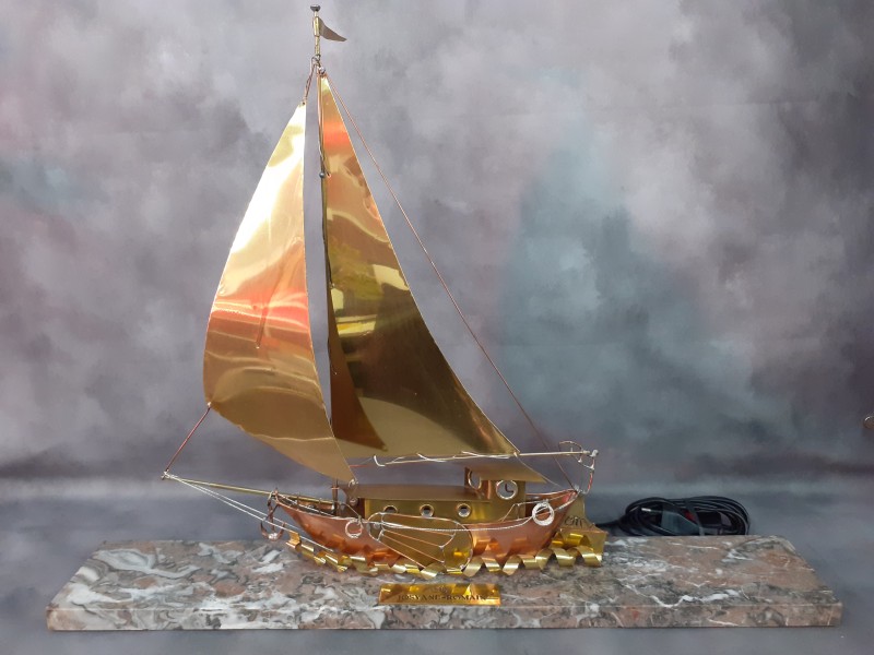 Elegante en karaktervolle tafellamp in de vorm van een zeilschip, uitgevoerd in messing en koperkleurig metaal, geplaatst op een zware marmeren voet. Het object combineert ambachtelijk vakmanschap met maritieme esthetiek en functioneert zowel als sfeerverlichting als decoratief kunststuk. Er is een gepersonaliseerde naamplaatje “50 – Josyane-Romain”.