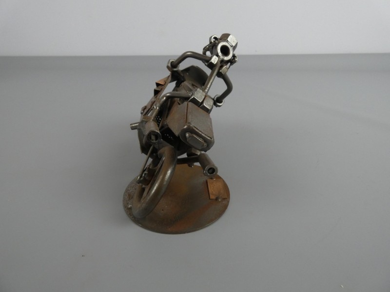 Dit robuuste en gedetailleerde sculptuur van een motorrijder op een sportmotor is vakkundig gemaakt van gerecyclede metalen onderdelen (moeren, bouten, etc.). Het is een perfect cadeau voor motorliefhebbers, verzamelaars van industriële kunst of als een stoer decoratiestuk voor thuis of op kantoor. Een echt blikvanger met een authentieke, verweerde look!