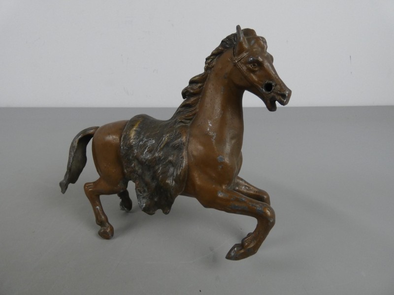 Dit decoratieve beeld van een steigerend paard is gemaakt van metaal en voorzien van een bruine afwerking. Het object verkeert in een gebruikte staat met duidelijke slijtplekken op de verf.