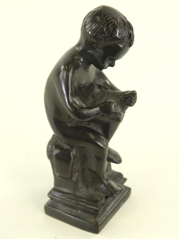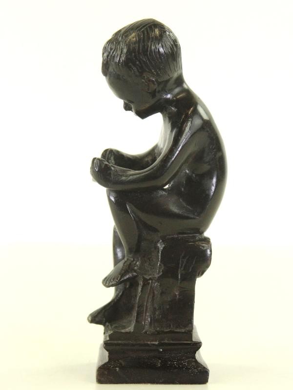 Dit kliene bronzen sculptuur toont een zittende jongen lezend in een ingetogen, contemplatieve houding. Fijn uitgewerkt beeld van een naakt jongetje, zittend op een compacte sokkel. De figuur buigt licht voorover en richt de blik naar de handen, wat zorgt voor een rustige, bijna introspectieve uitstraling. Het lichaam is zacht en natuurlijk gemodelleerd met ronde, kinderlijke vormen, terwijl het gezicht subtiel is uitgewerkt met kort, golvend haar in fijne lijnen. De donkere patina met zwartbruine glans geeft het geheel een klassieke en warme uitstraling. De sokkel is licht getrapt opgebouwd met een ruwer textuurcontrast en toont achteraan een draperie-achtig detail. Onderaan afgewerkt met onderaan een velvet stofje. Op de basis is een klein, onduidelijk merkteken aanwezig. Het oppervlak vertoont lichte slijtage, kleine krasjes en patinaverschillen die bijdragen aan het karakter van het stuk.