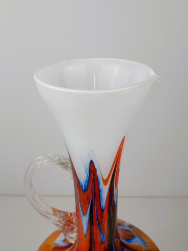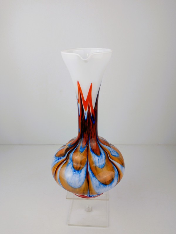Decoratieve vaas is gemaakt van opaline glas (ook wel melkglas genoemd) gemengd met gekleurde glazen slierten in oranje en blauw, wat de vaas een kenmerkende uitstraling geeft. Murano glas staat bekend om zijn hoge kwaliteit en wordt geproduceerd op het eiland Murano bij Venetië, Italië. De vaas is uitgevoerd in een opvallende kleurencombinatie: helder oranje, kobaltblauw, wit en rood vloeien in elkaar over in een gemarmerd patroon. Bovenaan is wit opaalglas duidelijk zichtbaar, typerend voor vetro opalino. De elegante vorm met uitlopende hals en sierlijk oor in helder glas wijst op vakmanschap. Dergelijke vazen waren populair in de jaren 1960–1970 als kunstzinnig woondecor. Geen merk of signatuur zichtbaar, maar de stijl is typisch voor Murano-glas uit die periode.
