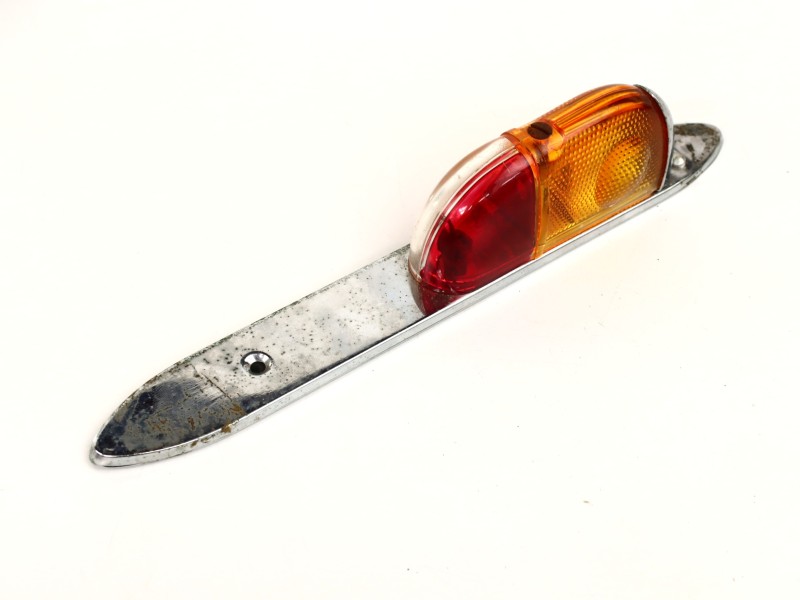 2. Een set van twee langwerpige achterlampjes. Een metalen montageplaat met twee schroefgaten, en daarop een gecombineerde lamp met oranje en rode lens, vastgezet met een schroef bovenop.