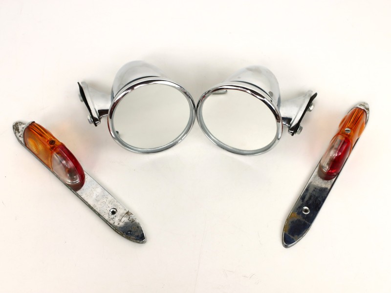 Een set van vier oldtimer accessoires waaronder Kever Bullet achteruitkijkspiegels.