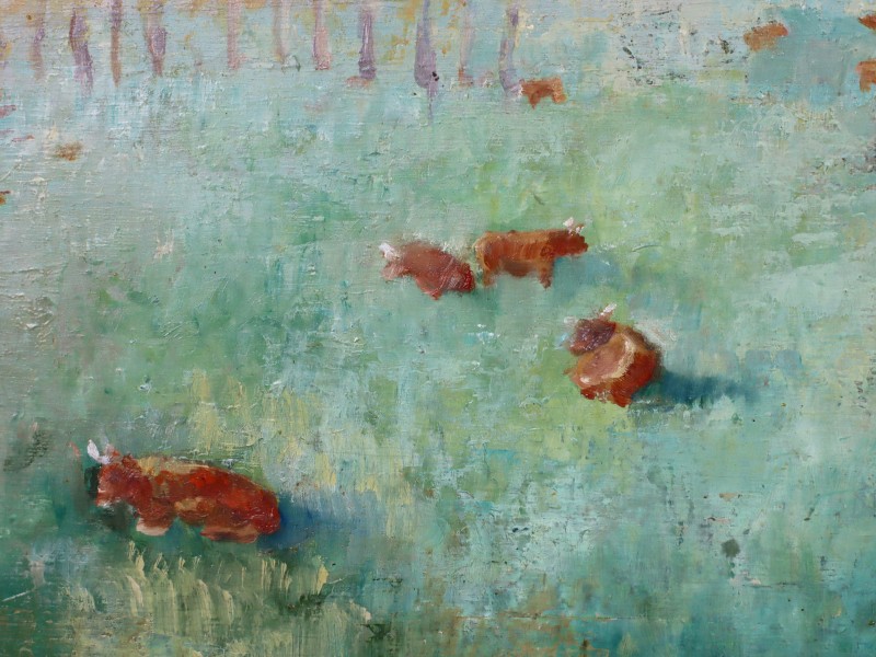 Sfeervol landschap met boerderijdieren, uitgevoerd in olieverf op paneel en gesigneerd door de Belgische kunstenares Augusta Hoste (1881–1965), afkomstig uit Tielt. Het werk toont een rustig Vlaams plattelandszicht waarin koeien en kippen op natuurlijke wijze zijn geïntegreerd in het landschap — een motief dat het landelijke leven van het begin van de 20e eeuw treffend weerspiegelt.
