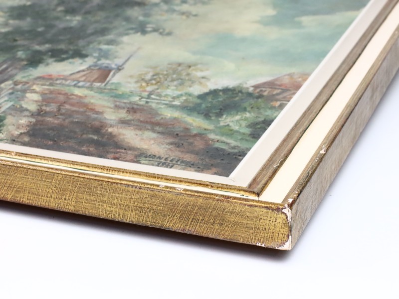 Schilderij is nog in goede staat, kleuren helder, geen zichtbare beschadigingen. Het kader heeft lichte gebruikssporen/beschadigingen passend bij de leeftijd.