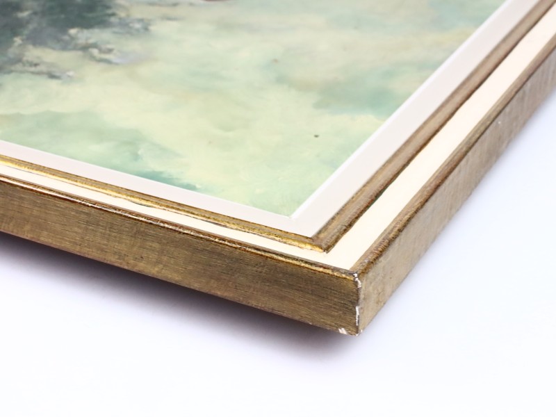 Dit werk is ingelijst met een kader in witte en goudaccenten, lichtgrijze houten passe-partout. Dateert 1e helft 20e eeuw (1941).