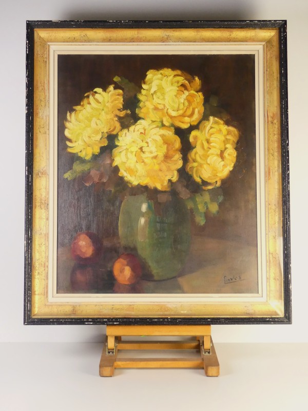 Dit prachtige olieverfschilderij toont een stilleven van gele chrysanten, zorgvuldig gerangschikt in een keramische vaas. De kunstenaar heeft met oog voor detail de schaduwen vastgelegd, wat diepte en realisme aan het werk toevoegt. Het schilderij is gesigneerd met “Devos” en dateert waarschijnlijk uit het midden van de 20e eeuw. Het geheel is achter glas ingelijst en heeft een afmeting van 63,5 x 74 cm inclusief de lijst.