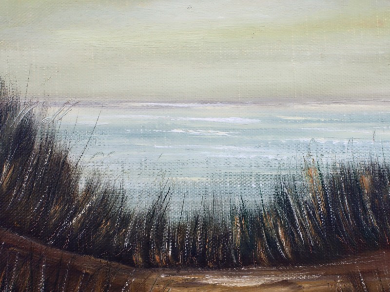 Groot schilderij van een rustgevend duinlandschap, met op de achtergrond een glimp van de zee, olieverf op doek. De titel is verzonnen.