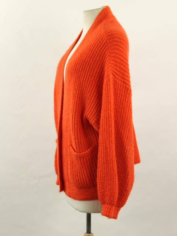 Opvallende, grofgebreide cardigan van Essentiel Antwerp in een heldere oranje kleur met een warme, licht pluizige textuur. Het model heeft een losvallende, rechte snit met verlaagde schoudernaden en volumineuze mouwen die eindigen in aansluitende ribboorden. De diepe V-hals en brede ribgebreide bies lopen door in een knoopsluiting met drie grote, matte knopen in natuurlook. Vooraan voorzien van twee ruime, opgestikte zakken die mooi opgaan in het ribpatroon. De onderzijde is afgewerkt met een brede ribboord, wat zorgt voor een mooi vallend silhouet.