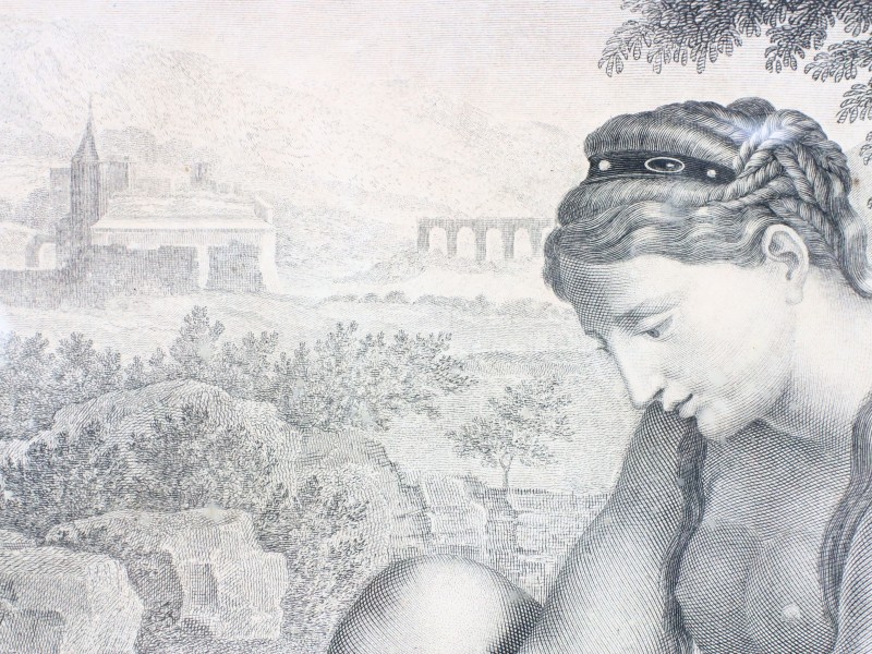 Prachtige luxe gravure op papier van Pierre Audouin (1768–1822), naar een tekening van Pierre Bouillon (1776–1831), gebaseerd op een compositie van Raphaël (1483–1520). Het werk toont de mythische scène van Venus die een doorn uit haar voet trekt, omringd door een weelderig landschap. Deze klassieke voorstelling symboliseert volgens de mythologie het ontstaan van de roos.