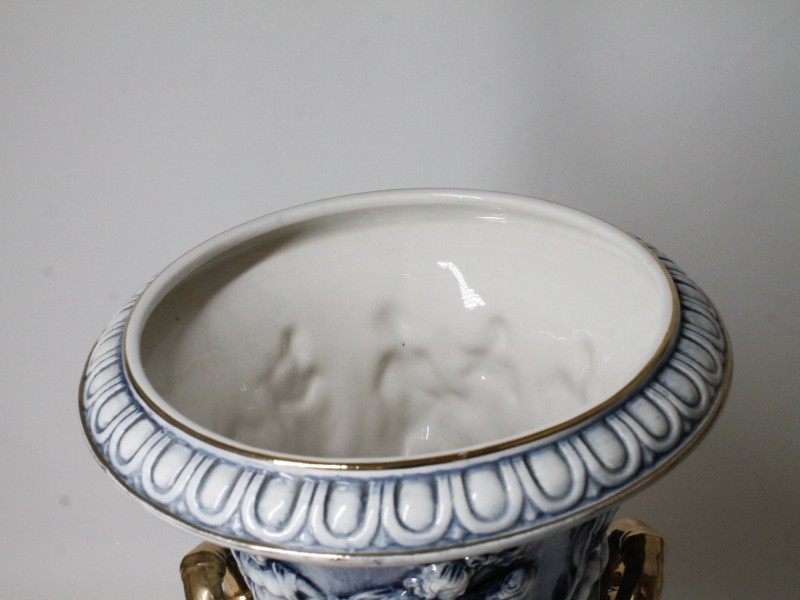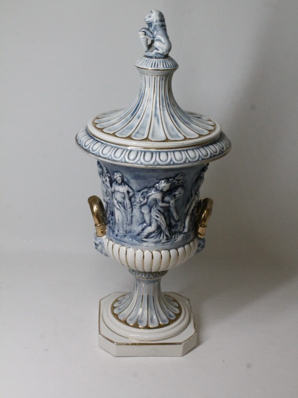 Een overdekte porseleinen vaas in Capodimonte-stijl, vervaardigd in Italië. Het zegel hiervan bevindt zich aan de onderkant van de vaas. De Capodimonte-stijl is een vorm van keramiek die is ontstaan in het Italiaanse stadje Capodimonte. De stijl kenmerkt zich door verfijnde details, delicate ontwerpen en vakmanschap. De vaas is rijkelijk versierd met gedetailleerde decoratie en een uitzonderlijk vakmanschap. Deze vaas is een verfijnd verzamelobject.