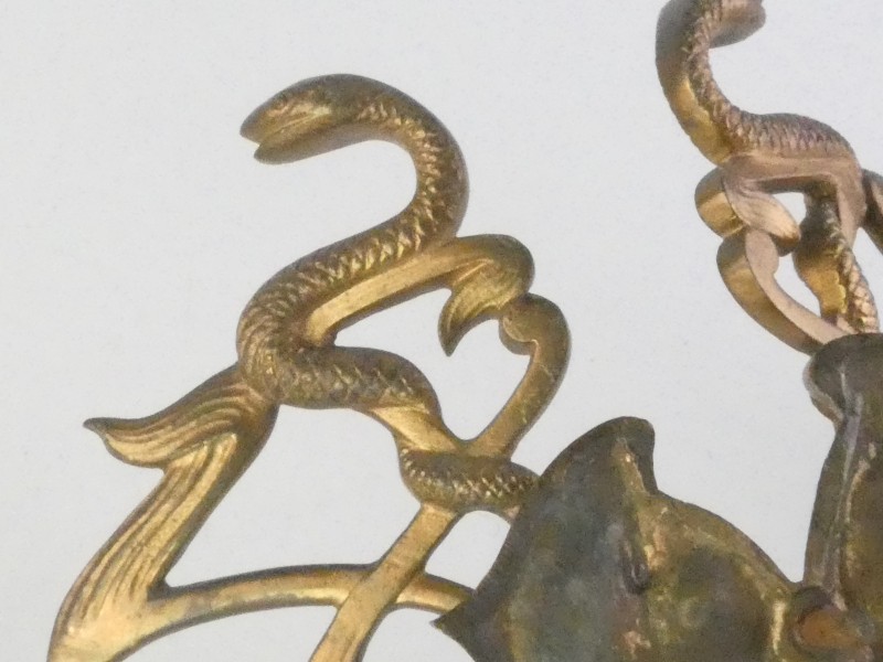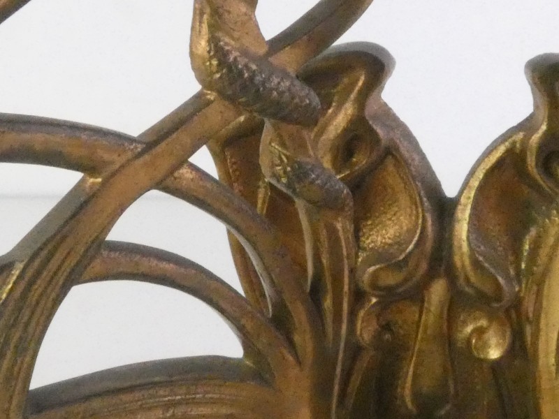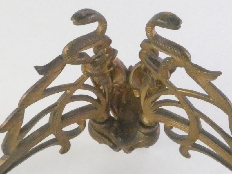 De kandelaars zijn uitgevoerd in een elegante Art Nouveau-stijl met sierlijke, symmetrische vormen en decoratieve motieven ontleend aan de natuur. Het bronzen oppervlak heeft een mooie, gelijkmatige patina die goed past bij de leeftijd van het object.