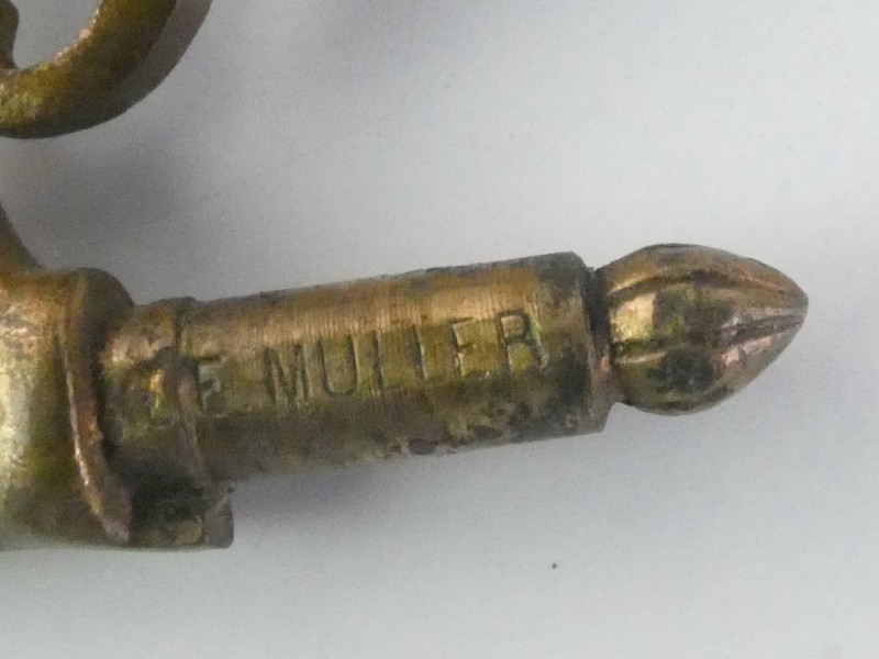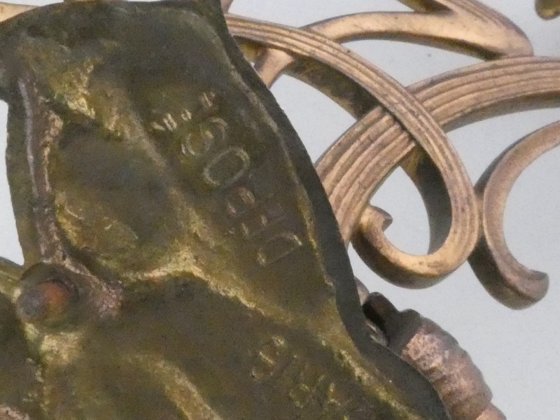Paar Art Nouveau wandkandelaars in gepatineerd brons, gesigneerd E. Muller, Paris, Déposé (Emile Muller, Frankrijk, ca. 1900).