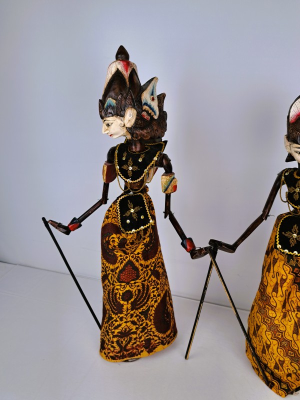 Het voorwerp bestaat uit twee handgemaakte houten poppen, vermoedelijk afkomstig uit Indonesië. Beide zijn gesneden uit donker hout, met lange armen en metalen staven waarmee de popdetails (zoals beweging of pose) kunnen worden beïnvloed. Ze dragen elk een skirt / rok in traditionele batik‑stof (gele en bruine kleurstelling) en hebben beschilderde hoofden met kenmerken van klassieke manier van weergave (scherpe neus, grote ogen, gebogen wenkbrauwen). Op de rug van één pop is een vis‑vormig element aangebracht, wellicht symbolisch of decoratief van aard.