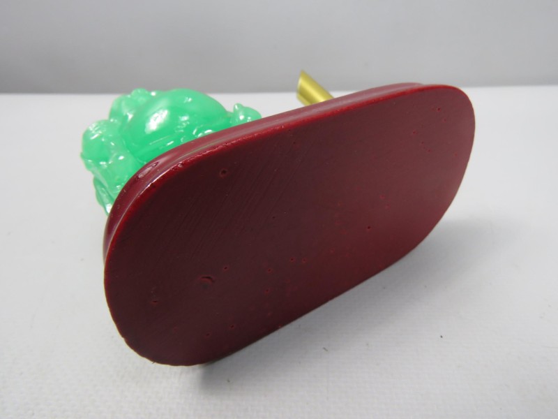 Goudkleurige pennenhouder met een beeldje van een Lachende Boeddha, gemaakt van jade of een jade-achtige hars. Niet gemerkt.