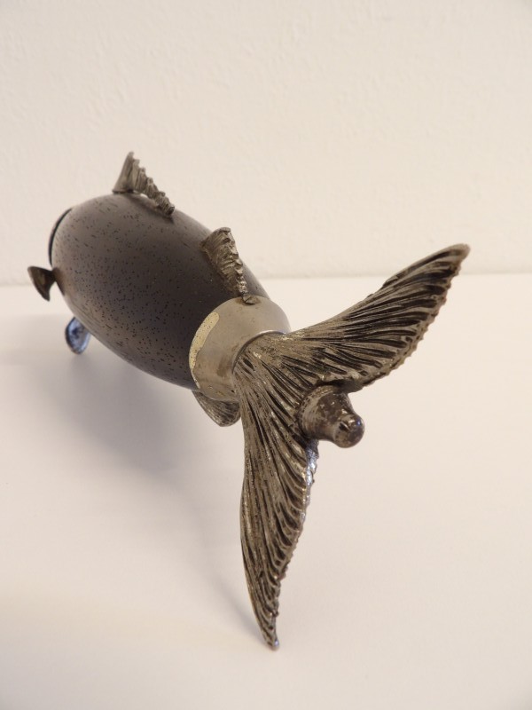Vintage pepermolen in de vorm van een vis, geproduceerd door het Italiaanse merk Tre Spade rond de jaren 60.