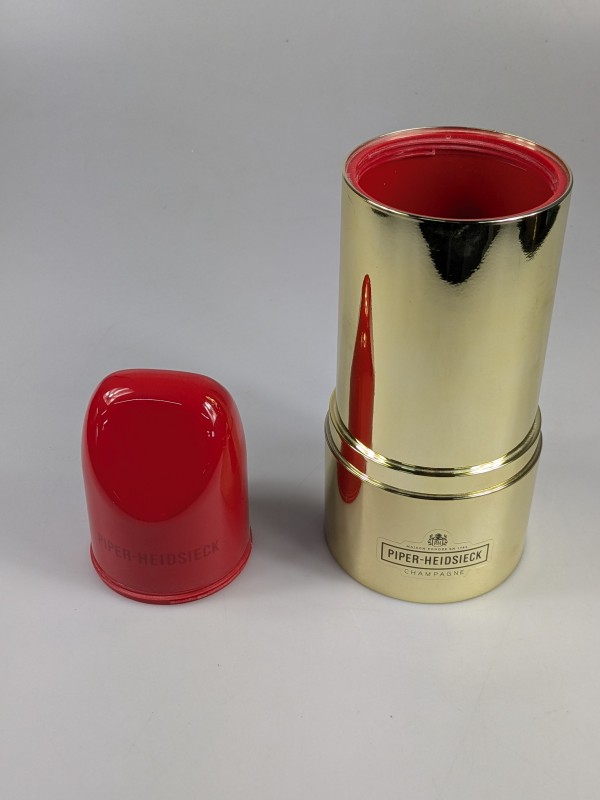 Unieke champagnekoker van het merk Piper-Heidsieck, uitgevoerd in een opvallend lipstick-design. Deze speciale editie is ideaal als cadeauverpakking, decoratie of verzamelobject. De koker is goudkleurig met een rode kap en draagt de officiële Piper-Heidsieck opdruk. Geschikt voor een standaardfles champagne.