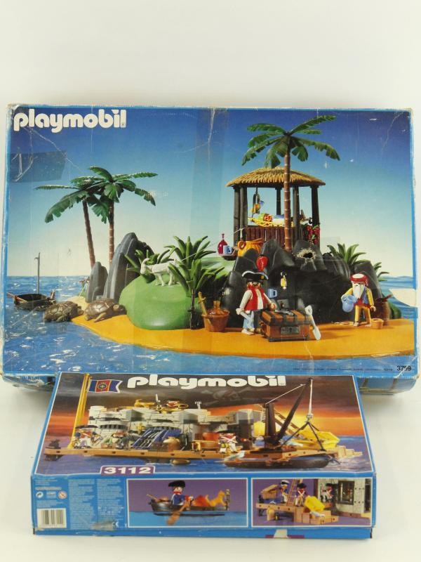 Dit lot bestaat uit twee vintage Playmobil sets met piratenthema, waaronder een pirateneiland en set 3112 (haven/fort).